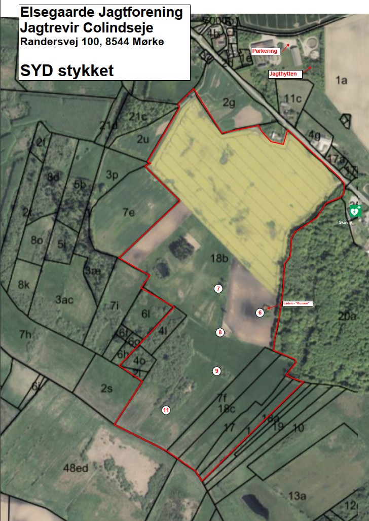 Her er et kort over vores jagt revir ved Colindseje i Bendstrup nær Termestrup på Djursland, kaldet Sydstykket.